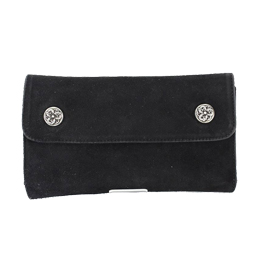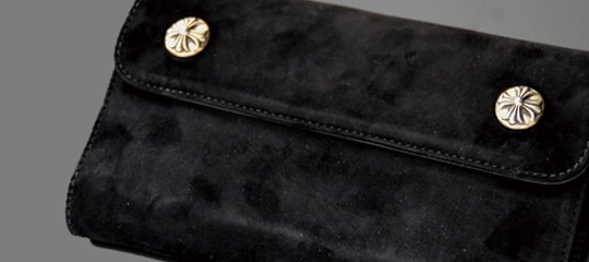 クロムハーツでは、不定期に「アザーレザー」をリリースしていますが、その一つがベルトや財布に使用されている、スウェードレザーです。スウェードレザーとは、革の表面をベルベット状に起毛させたもので、独特の光沢感と高級感が魅力です。スウェードレザーはクロムハーツではレギュラーレザーではないため、革がなくなり次第生産もなくなるといわれています。見つけたら即買いのレアアイテムです!