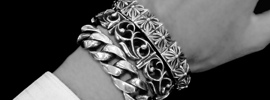 シルバーは特性である硫化という化学反応により、使用頻度に関係なく黒くなります。この黒ずみを取り除くために便利なアイテムがシルバー磨きです。シルバー磨きとは、微粒子の研磨剤を柔らかいフェルト生地に含ませたシルバー製品専用の布のことを言います。このシルバー磨きでブレス等の表面を磨いてあげれば、簡単に黒ずみを取り除くことができます。しかし、強く磨き過ぎてしまうと、SBTやスクロールなどの繊細なデザインは、模様が薄くなってしまうことがありますので注意しなければなりません。