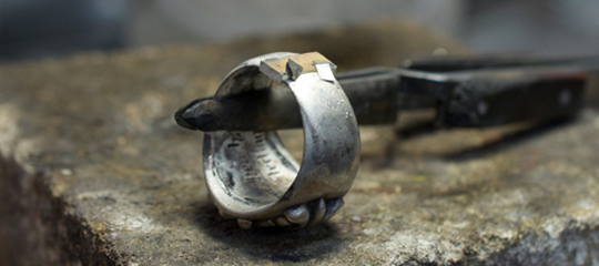 通常のシルバーリングは1番後ろにくる部分をロウ付けしてサイズ直しをするのですが、クロムハーツのリングは刻印が入っているため刻印の部分は避けてお直しをします。黒い燻し加工がしてあるモチーフ部分は、通常のロウ付けで火をかけてしまうと一気に燻しが取れてしまいます。そこで燻しのかかったモチーフ部分の修理に最適なレーザーロウ付けでサイズ直しをしていきます。両サイドの腕を短くしバランスを整えるため、モチーフを1度切りはずします。再びモチーフをレーザーでロウ付けしていきます。この作業を行うことで、モチーフもクロムハーツの刻印も中央のままバランスよく綺麗にお直しができます。